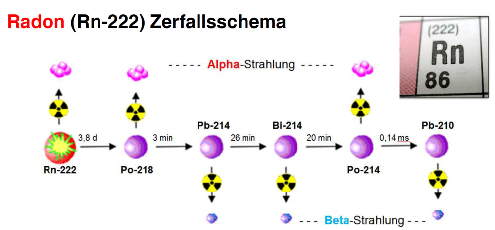 Durch die einwirkende Strahlung wird das Gesundheitsrisiko, insbesondere für Lungenkrebs,