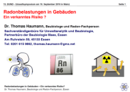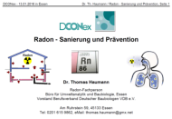 Publikationen Anbei eine Übersicht über einige Veröffentlichungen und Vorträge zum Thema Radon aus den letzten Jahren und die Publikationsliste von Dr. Thomas Haumann. Einige Beiträge stehen auch als download zur Verfügung: Haumann Th.; „Radon – ein unbemerkter radioaktiver Innenraumschadstoff“, Der Zimmermann 7. - 8.2020 (2020), BRUDERVERLAG Albert Bruder Haumann Th.; „Radon in Innenräumen – Teil 1 und Teil 2“, Gebäudeschadstoffe und Innenraumluft (2020) Band 10 und 11, Rudolf Müller Verlag Haumann Th.; „Radon – ein signifikantes Lungenkrebsrisiko im Innenraum, Gefahrstoffe – Reinhaltung der Luft 79 (2019) Nr. 3 – März, VDI-Fachmedien Haumann Th.; „Radonschutz in der Praxis“, der Bauschaden 34, 7. Jahrgang Ausgabe Februar/März 2019 Haumann Th.; „Radon 2.0" im Tagungsband zum Kongressprogramm DCONex, 30.1.2019 in Essen Haumann Th.; „Messtechnik Radon“, 19. Deutscher Sachverständigentag 09.11.2017 in Leipzig Haumann Th. und Münzenberg U.; „Radonmessungen im Unterdruckverfahren“  B+B Bauen im Bestand, Rudolf Müller Verlag, 40. Jahrgang Dezember 2017 Haumann Th.; „Radonmessungen und Blower Door - Fallbeispiele aus Bestandsgebäuden“, 2. Radonfachtag des Berufsverbandes Deutscher Baubiologen VDB e.V. am 4. Mai 2017 im Bauzentrum München Haumann, Th.; "Radonbelastungen in Gebäuden - Ein verkanntes Risiko?" Vortrag zum 15. BUND - Umweltsymposium am 10. September 2016 in Mainz Haumann Th.; „Radon-Messverfahren“, 12. AGÖF-Fachkongress 17.11.2016 in Hallstadt bei Bamberg Haumann, Th.; "Radon - Sanierung und Prävention" In: Tagungsband zum Kongressprogramm DCONex, 13. Januar 2016 in Essen Haumann Th.; „Thoron in Lehmhäusern  - Materialprüfungen und Fallstudien“, 1. Radonfachtag des Berufsverbandes Deutscher Baubiologen VDB e.V. am 23. April 2015 im Bauzentrum München -> Veröffentlichungen, Vorträge und Publikationsliste